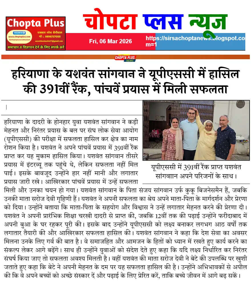 हरियाणा के चरखी दादरी के रहने वाले यशवंत सांगवान ने वो कर दिखाया है, जिसका सपना देश के लाखों युवा खुली आंखों से देखते हैं। लगातार 8 साल की कड़ी मेहनत और 4 असफलताओं के बाद, यशवंत ने अपने 5वें प्रयास में UPSC परीक्षा में 391वीं रैंक हासिल कर पूरे प्रदेश का नाम रोशन कर दिया है। तीसरे प्रयास में इंटरव्यू तक पहुंचकर भी जब बात नहीं बनी, तो वे टूटे नहीं बल्कि दोगुनी ताकत से बाउंस बैक किया। एक बिजनेसमैन पिता और हाउसवाइफ मां के इस बेटे ने साबित कर दिया है कि अगर मन में कुछ कर गुजरने की जिद हो, तो कोई भी मंजिल दूर नहीं होती।