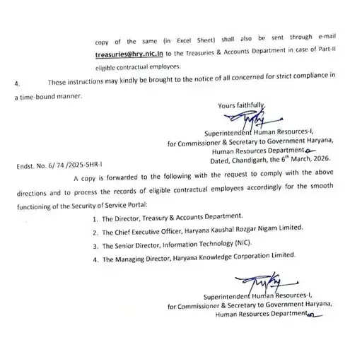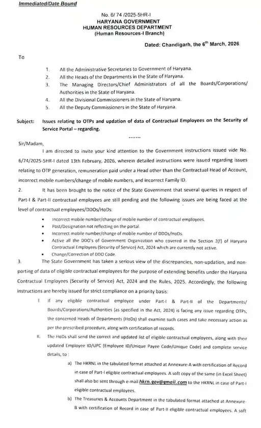हरियाणा सरकार ने 'सिक्योरिटी ऑफ सर्विस' (Security of Service) पोर्टल पर कॉन्ट्रैक्ट कर्मचारियों के रिकॉर्ड में आ रही भारी गड़बड़ियों को लेकर बेहद सख्त रुख अपनाया है। मुख्य सचिव अनुराग रस्तोगी ने सभी विभागों को दो टूक चेतावनी दी है कि पोर्टल पर मौजूद त्रुटियों और लंबित मामलों को तुरंत ठीक किया जाए। ऐसा न करने वाले और लापरवाही बरतने वाले अधिकारियों पर अब सीधी कार्रवाई की जाएगी। दरअसल, डेटा अपडेट न होने के कारण पात्र कर्मचारियों को 'हरियाणा कॉन्ट्रैक्ट कर्मचारी (सेवा सुरक्षा) अधिनियम-2024' के तहत मिलने वाले लाभों में अड़चन आ रही है।